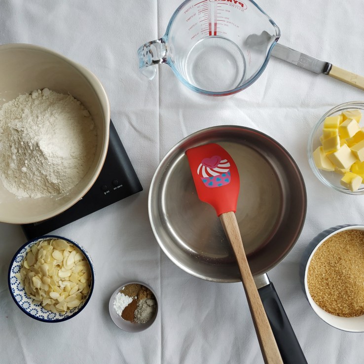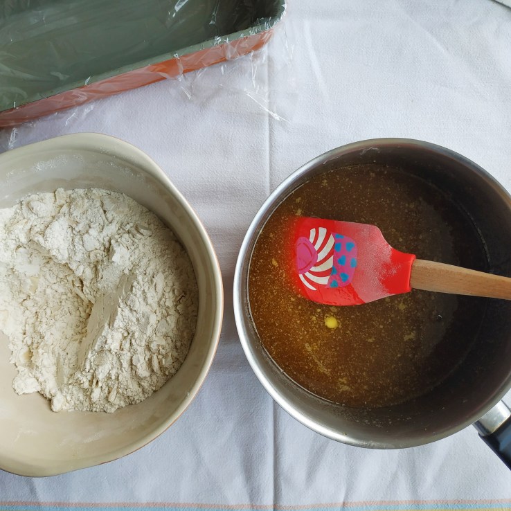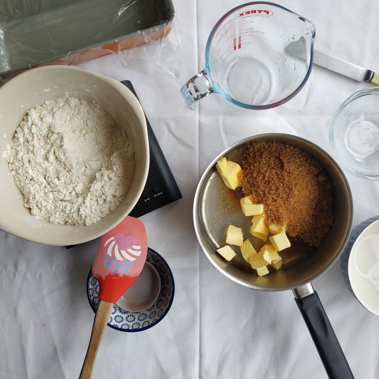 Place the butter in a medium saucepan over a medium-low heat along with the sugar and water. Stir until the butter has just melted, but don’t boil the mixture, most of the sugar should not be dissolved. Remove from the heat.