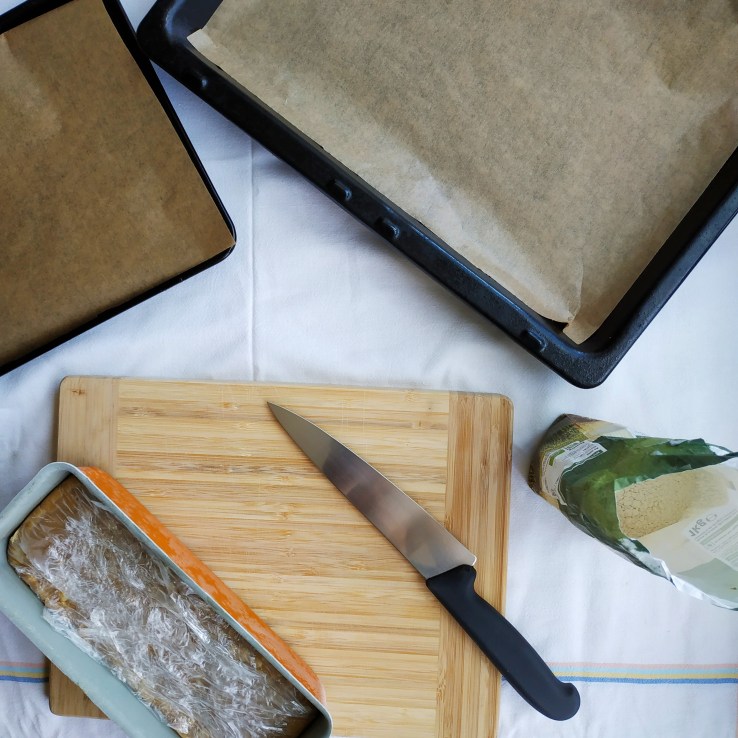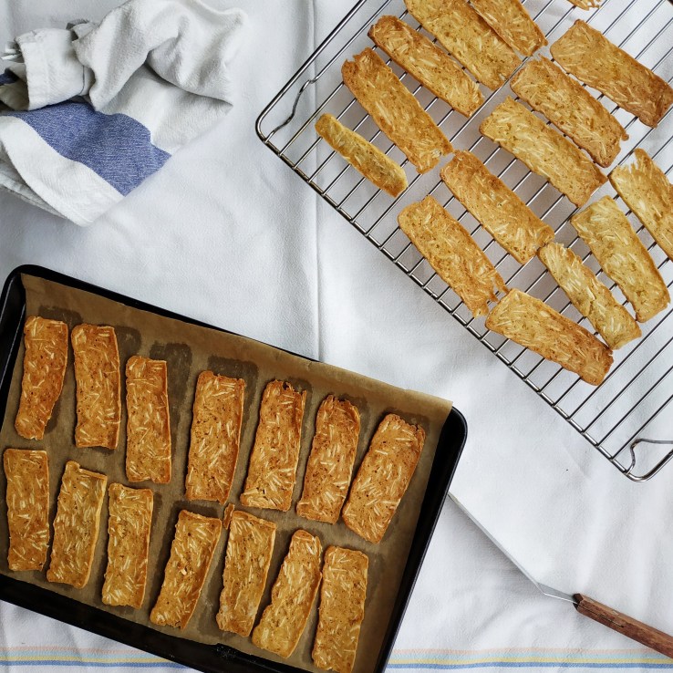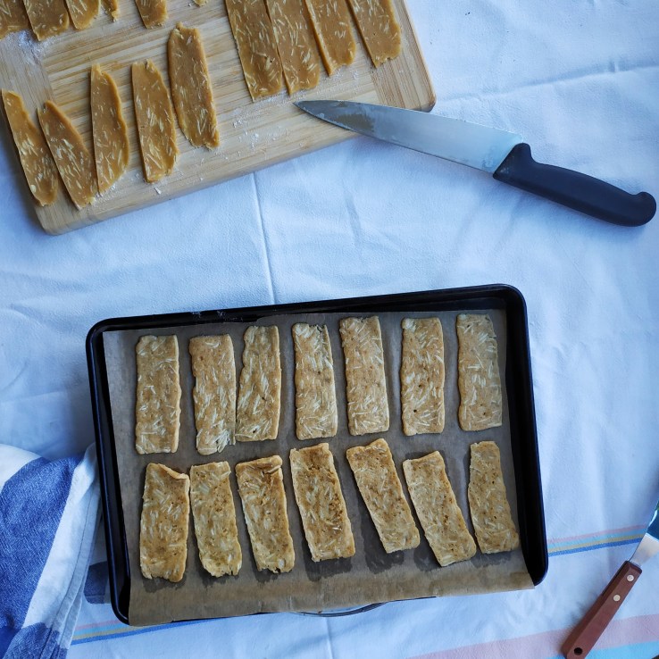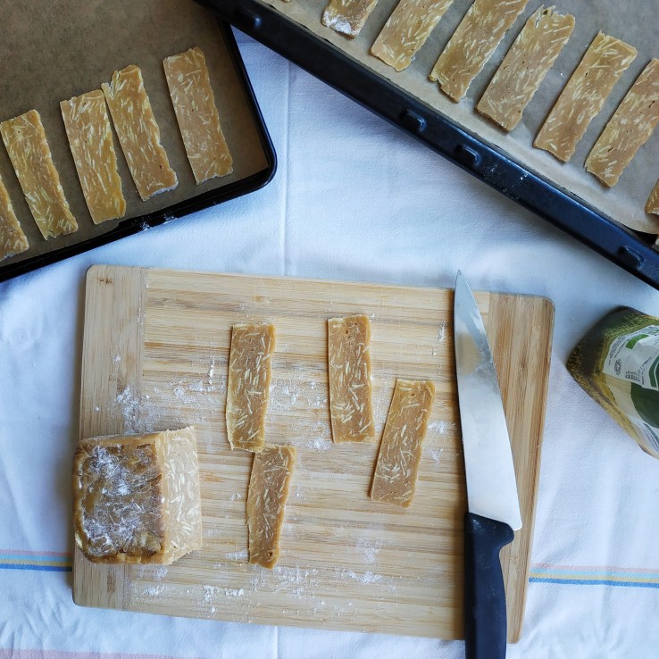 Remove the dough from the fridge and take off the clingfilm. The dough may feel a bit sticky on the outside, if so, dust all over with a little flour. Using a very sharp knife, slice the dough crosswise into rectangles approximately 2mm (as thick as a couple of credit cards stacked together) thick. It’ll take some practice to get them even and the right thickness, but don’t worry, even the wonky ones seem to get eaten!